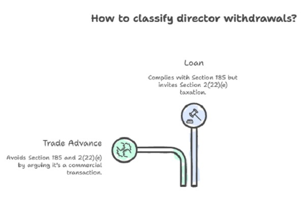 - Companies Act Conflict: Section 185 prohibits loans to directors. If a company classifies a withdrawal as a “Trade Advance” to avoid Section 185 (arguing it’s in the ordinary course of business), it helps the tax defense against 2(22)(e) (trade advances are not dividends). Conversely, if the company treats it as a “Loan” and complies with Section 185 (via special resolution), it invites Section 2(22)(e) taxation.