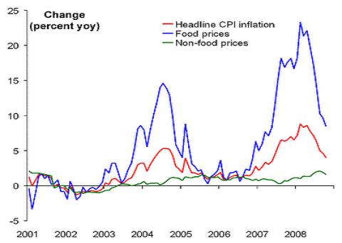 1) The above index chart depicts that CPI and food prices have started rising from 2003-2005.Where as non food items were lower at that point of time. Then we find a controlled price and CPI remaining below the level of 5.Suddenly from 2006 end to till date inflation and food prices started climbing back breaking all past levels.