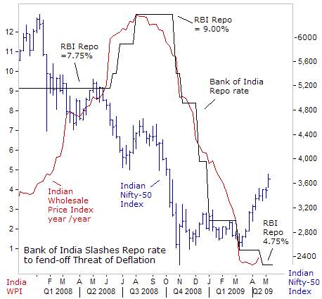 2) In the below chart I have tried to bring forward the actions taken by RBI in 2008 to 2nd quarter of 2009,in parallel to repo – rates, stock market index movements along with CPI.