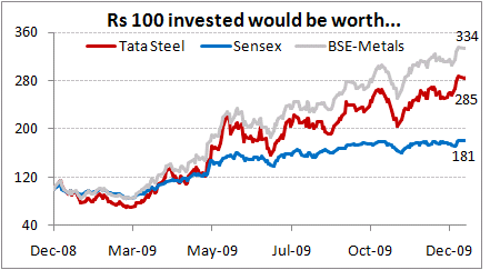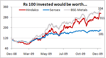 With gains in the region of 200%, Hindalco and Tata Steel are amongst the top ten Sensex performers during the year. We have decided to club the two together as we believe the factors that first led to the precipitous decline in their stock prices and then a meteoric rise in 2009 were extremely similar. Infact, both these companies could be called as the epitome of what happened the world around at the peak of the sub-prime boom and then in its devastating aftermath. On second thoughts, even Tata Motors, the top performer for the year, would fit this description.