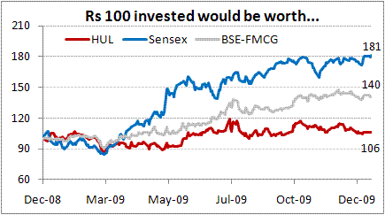 After a stellar performance in 2008 when Hindustan Unilever Limited (HUL) was one of the best performing stocks, the company disappointed investors in 2009. With gains of merely 6% YoY during the year, the company was one of the Sensex underperformers. The reason for this is not far to find. The company seems to have misjudged the preference of its consumers and ended up with the wrong strategy during the year. With rising raw material costs, the company increased the price of its products while shifting it’s focused to premium products which were perceived to be recession proof. However, consumers in an effort to find value offerings either switched brands or down traded. This benefited HUL’s competitors, who by taking a hit on margins after absorbing higher costs were able to gain market share. The result was HUL losing its customers and facing the daunting task of regaining its lost market share.