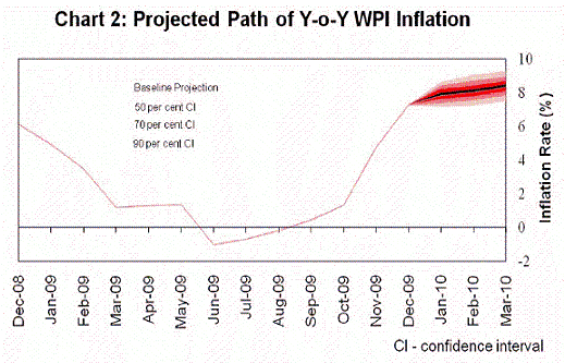 26. The Second Quarter Review of October 2009 projected WPI inflation of 6.5 per cent with an upside bias for end-March 2010. The upside risks in terms of higher food prices reflecting poor monsoon have clearly materialised. However, some additional factors have also exerted upward pressure on WPI inflation. One, the expected seasonal moderation has not taken place, other than in vegetables. Two, prices of the non-administered component of the fuel group, tracking the movement in global crude prices, have also risen significantly. Three, there have also been some signs of demand side pressures. The Reserve Bank’s quarterly inflation expectations survey for households indicates that inflation expectations are on the rise. Keeping in view the global trend in commodity prices and the domestic demand-supply balance, the baseline projection for WPI inflation for end-March 2010 is now raised to 8.5 per cent.